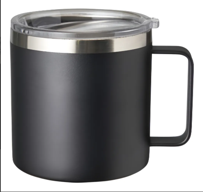 Caneca térmica em aço inox com parede dupla isolada à vácuo, tampa plástica e anel em silicone para vedação, alça lateral. Capacidade 350ml. parede externa com pintura a pó.